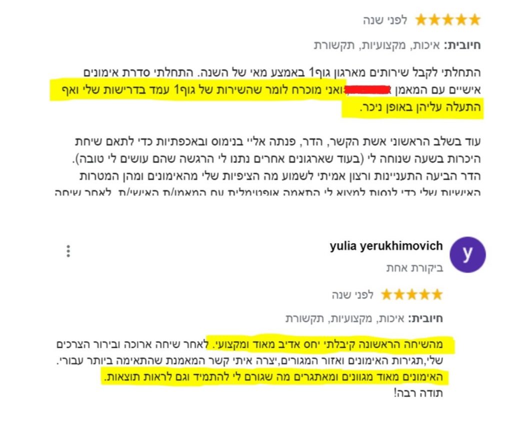 בנוסף, על ידי התאמת לקוחות למאמן הנכון כבר מההתחלה, גוף1 מצליחים לעזור למרבית הלקוחות להימנע מהתסכול וההוצאות המיותרות של עבודה עם המאמן או המאמנת הלא נכונים להם. במקום לבזבז זמן וכסף על מאמנים שלא מתאימים לצרכים שלהם, לקוחות יכולים להתחיל עם מאמן שמתאים להם כבר מההתחלה. ב- 95% מהמקרים ההתאמה מצוינת מרגע א'.